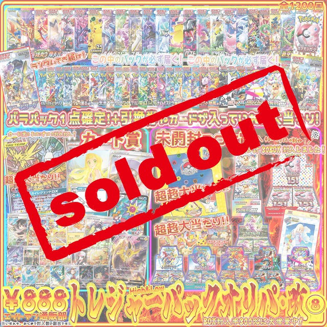 12月8日 キャンセル分在庫追加しました! ------------------------------- \大人気オリパが超パワーアップして登場/ 【 ¥888☆トレジャーパックオリパ・改⑧ 】 ~BOX賞300%に大増量 High&Low仕様~ パック1点確定! さらに、引換券やカードが入っていれば大当たり! -------------------------------- ♡1口:888円(税込)全1200口 ※こちらのオリパは、1会計につき22口までのご注文とさせていただきます。22口以上購入をご希望の方は複数回にわけてご注文くださいませ。 また、ご注文前に必ず商品説明欄の注意事項を最後までお読みください。 お支払い完了後、お客様都合でのキャンセルはお受けしておりません。個数変更も含め、システムの都合上できません。なにかありましたらBASEへ直接お問い合わせください。また、銀行振込やコンビニ支払いでの注文キャンセル回数が多い場合にはブラックリストに登録させていただきます。 ※当選された方は、通販部BASEの問い合わせからご連絡ください。 その際にスクラッチの写真が必要となりますため、大切に保管をお願い致します。 ******************************* ♡はずれても以下のパック1点確定!※パックは1Pのみです ・ドリームリーグ ・VMAXクライマックス ・イーブイヒーローズ ・蒼空ストリーム ・ソード ・シールド ・爆炎ウォーカー ・摩天パーフェクト ・双璧のファイター ・反逆クラッシュ ・ムゲンゾーン ・仰天のボルテッカー ・ロストアビス ・スペースジャグラー ・タイムゲイザー ・スターバース ・ポケモンGO ・ダークファンタズマ ・バトルリージョン ・漆黒のガイスト ・白銀のランス ・フュージョンアーツ ・白熱のアルカナ ・パラダイムトリガー ・25thAnniversarycollection ・VSTARユニバース ・バイオレットex ・スカーレットex ・トリプレットビート ・スノーハザード ・クレイバースト ・ポケモン151 ・黒炎の支配者 ・レイジングサーフ ・未来の一閃 ・古代の咆哮 ・ワイルドフォース ・サイバージャッジ ・クリムゾンヘイズ ・変幻の仮面 ・シャイニートレジャーex ・ナイトワンダラー ・ステラミラクル ・楽園ドラゴーナ ・超電ブレイカー ・テラスタルフェスex ・バトルパートナーズ ・熱風のアリーナ ・ロケット団の栄光 ・ブラックボルト NEW ・ホワイトフレア NEW ・メガブレイブ NEW ・メガシンフォニア NEW 上記記載のパック以外にも、 ソード&シールドシリーズ以降のレアな絶版パック封入中! ※High&Low仕様のため、新弾(SVシリーズ)パックが多めとなっております。※ ******************************* 《未開封BOX当たり》 ☆ポケモンワールドチャンピオンシップス 2023横浜 記念デッキ『ピカチュウ』 未開封引き換え券 ☆スペシャルボックス ポケモンセンター トウホク ★テラスタルフェス 未開封引き換え券 ★ポケモンカード151 未開封引き換え券 ★スペースジャグラー 未開封引き換え券 ★コレクションファイルリーリエ 未開封引き換え券 ★レイジングサーフ 未開封引き換え券 ★バトルパートナーズ 未開封引き換え券 ★熱風のアリーナ 未開封引き換え券 ★メガブレイブ 未開封引き換え券 ★メガシンフォニア 未開封引き換え券 ★計30BOX封入しました!40口に1口の割合!※★ ※あくまで封入率の割合です。ランダムでお届けします※ ※40口購入で必ず1口当たるわけではございません※ ※当選された方は、通販部BASEの問い合わせからご連絡ください。 その際にスクラッチの写真が必要となりますため、大切に保管をお願い致します。 《カード大当たり》 ☆ファイヤー&サンダー&フリーザーGX SA ★リーリエの決心 SAR ★カトレア SR ★yu nagabaブラッキー ★スターミー CSR ★サンダースV SA ☆ヒガナの決意 ☆ブースターex SAR ☆サンダースex SAR ☆ピカチュウ S ☆カミツレのきらめき SR ・スイクンVSAR・チリSAR・イーブイAR ・ミュウAR・トウコSR・エルフーンexSAR 他サポートSR・モンスターSRなど… ★カード賞(SR以上)は5口に1口の割合封入!※★ ※あくまで封入率の割合です。ランダムでお届けします。5口購入で必ず1口当たるわけではございません※ ※当たり賞には、SR以下の高額カードも存在します※ ※レギュレーション外のカードが入っている場合がございます※ ※High&Low仕様のため、新弾(SVシリーズ)パックが多めとなっております。※ ♡発送について: OPP袋・プチプチ封筒で梱包いたします。 ※※※お願い・注意事項※※※※※※※※ ①カードの状態につきましては一律プレイ用としてお考えください。 ※レギュレーション外のカードが入っている場合がございます※ ②比較的状態の良い物を選別しておりますが、キズ(裁断傷・初期傷含む)・カケが含まれている場合もございます。また、中古品であることをご了承の上購入お願い致します。 ③オリパはシャッフル後、購入口数分梱包を行う為カードに偏りがある場合がございます。 商品の性質上、当たり外れが存在します。必ずお目当てのカードを引けるというわけではございません。 ご理解・ご了承の上購入お願い致します。 ⑤商品の返品・返金・交